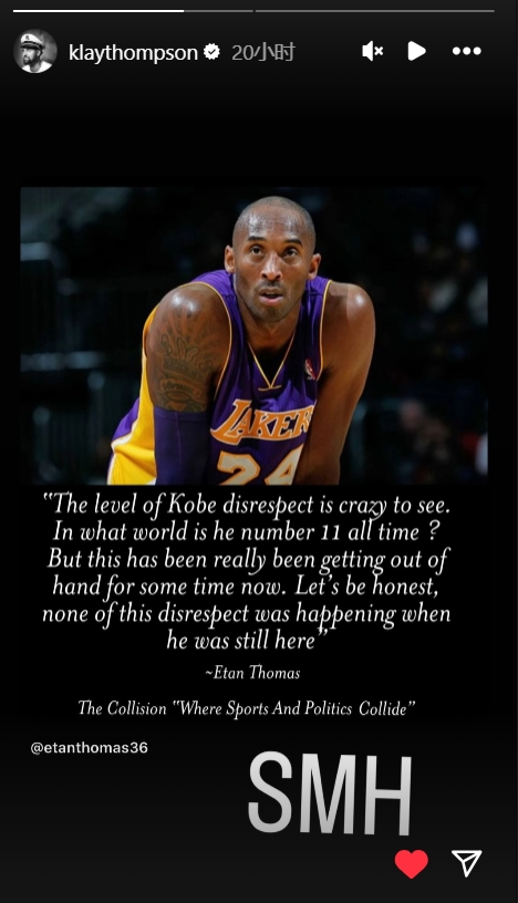 克莱写道:“对科比的不尊敬已经到了疯狂的程度,在哪个平行宇宙中,他会掉到11位?现在这样的事情已经失控了,我们老实讲,如果科比还活着,这些对他不尊敬的事情根本不会发生”。