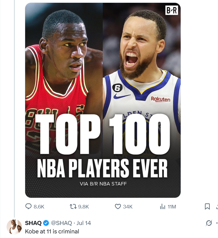 除此之外,奥尼尔也为科比的排名打抱不平,他写道:“这排名,简直是在犯罪”。