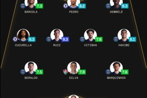 前锋:巴尔科拉(巴黎,7.3分)、若昂-佩德罗(切尔西,8.2分)、登贝莱(巴黎,8.3分)